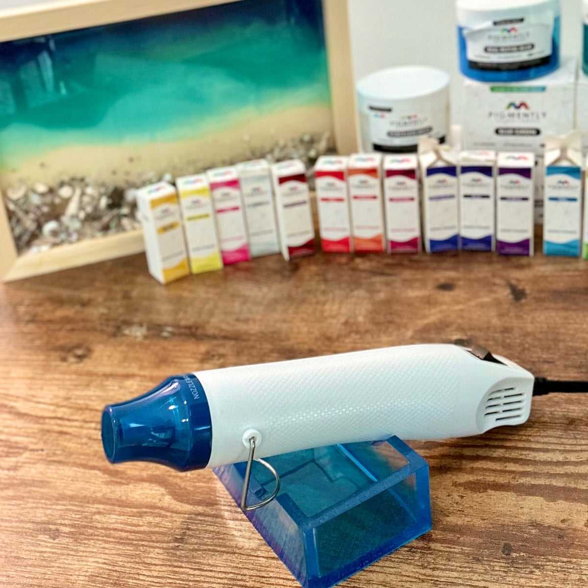 This heat gun is perfect for epoxy resin crafts, as well as heating shrinkable film, molding clay, setting embossed powder, stripping paint, defrosting, and cleaning, this mini heat gun has a built-in stand for convenient self-support and tabletop use.